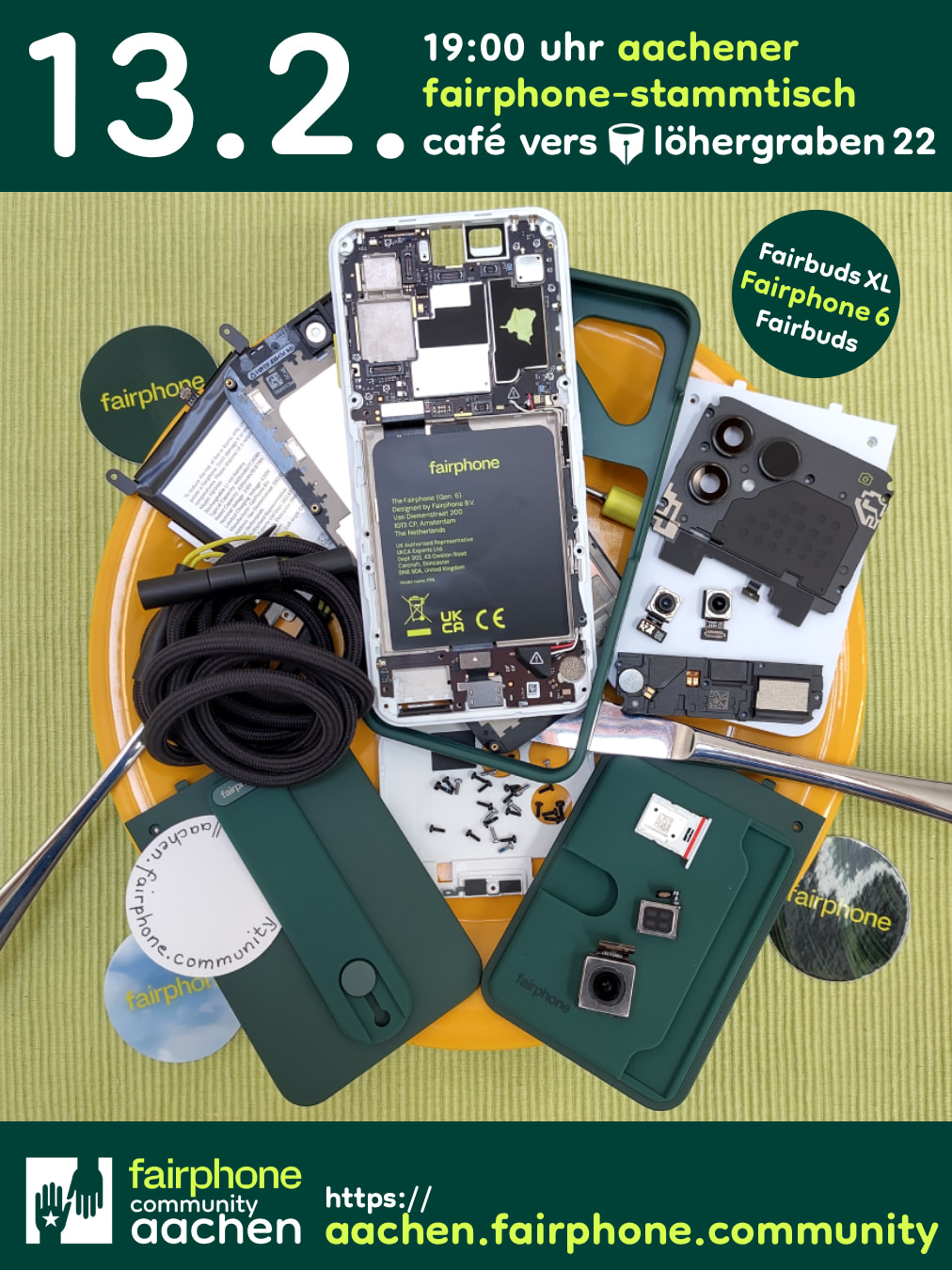 ![13. Februar 2026 | Aachener Fairphone-Stammtisch [EN in 2nd half] Weiße und schwarze Einzelteile eines Smartphones und waldgrünes Zubehör liegen auf einem gelben Teller, darunter Messer und Gabel. Unter dem Teller ein waldgrüner, ein grün-schwarzer und ein himmelblauer Aufkleber jeweils mit dem limettenfarbenen Schriftzug "fairphone". Alles liegt auf einem lindgrünen Tischset. Ganz oben auf waldgrünem Grund: "13.2. 19:00 uhr aachener fairphone-stammtisch – café vers löhergraben 22" In einem waldgrünen Kreis rechts oberhalb des Tellers: "Fairbuds XL – Fairphone 6 – Fairbuds". Unter dem Set auf waldgrünem Grund ein Logo aus zwei waldgrünen, sich gegenseitig entgegenstreckenden Händen in einem weißen Quadrat, daneben Text: "fairphone community aachen – https://aachen.fairphone.community". ENGLISH: White and black parts of a smartphone and forest green accessories lie on a yellow plate, a knife and a fork underneath them. Under the plate a forest green, a green and black and a sky blue sticker each bearing the lime-colour lettering "fairphone". All this is lying on a linden green placemat. At the top on forest green background: "13 February 19:00 h aachener fairphone-stammtisch – café vers löhergraben 22" In a forest green circle to the top right of the plate: "Fairbuds XL – Fairphone 6 – Fairbuds". Below the set on forest green background a logo of two forest green hands reaching towards each other in a white square, next to it text: "fairphone community aachen – https://aachen.fairphone.community".](https://forum.fairphone.com/uploads/default/optimized/3X/3/b/3b28ec84b839eed8845a1393d012556c23a13fa1_2_374x500.jpeg)