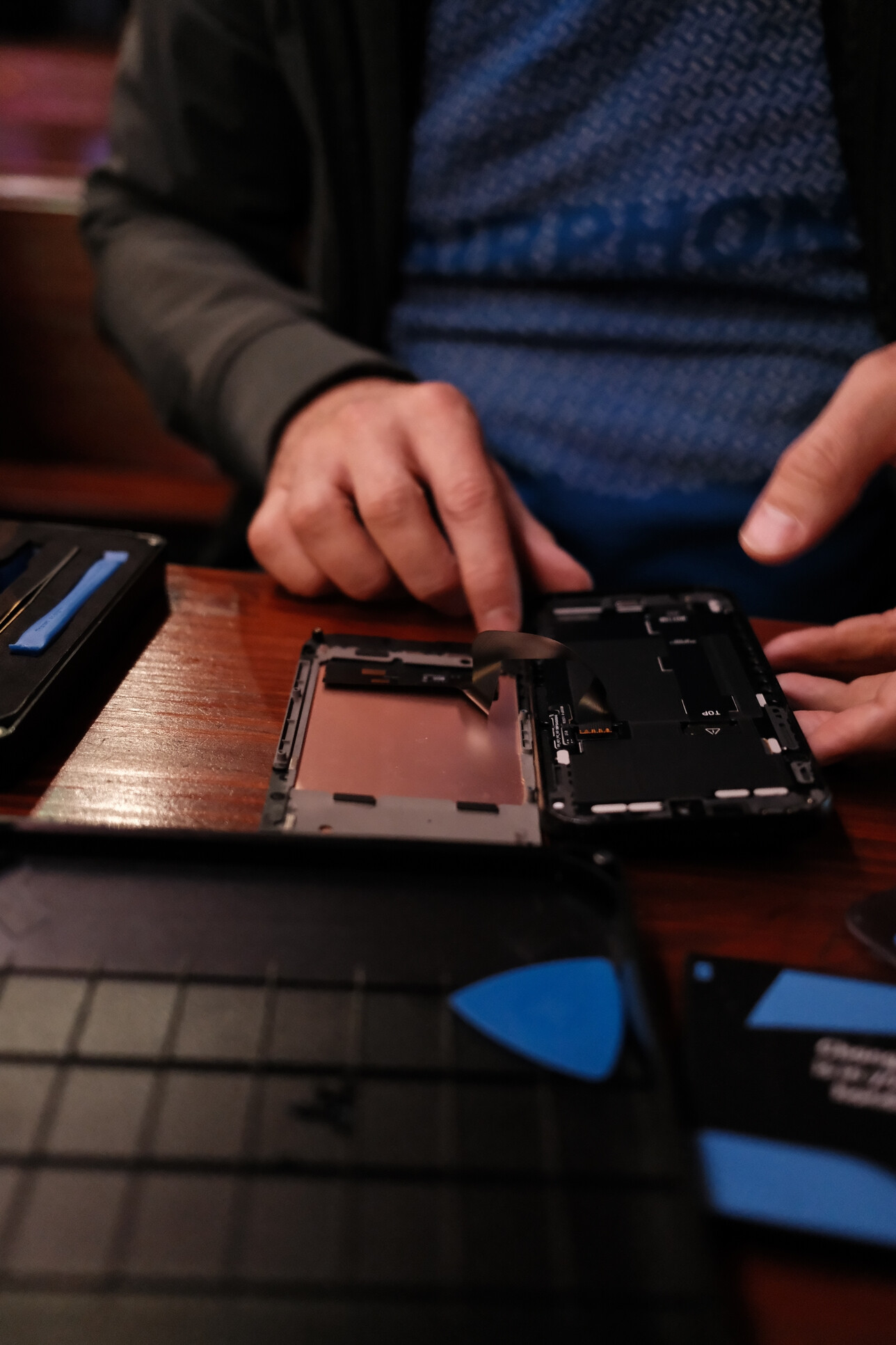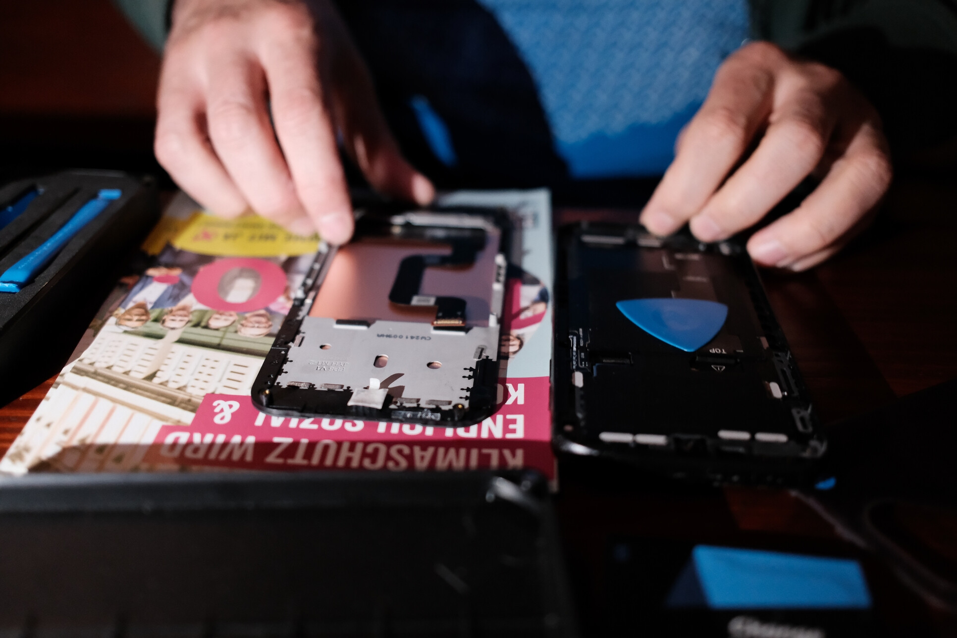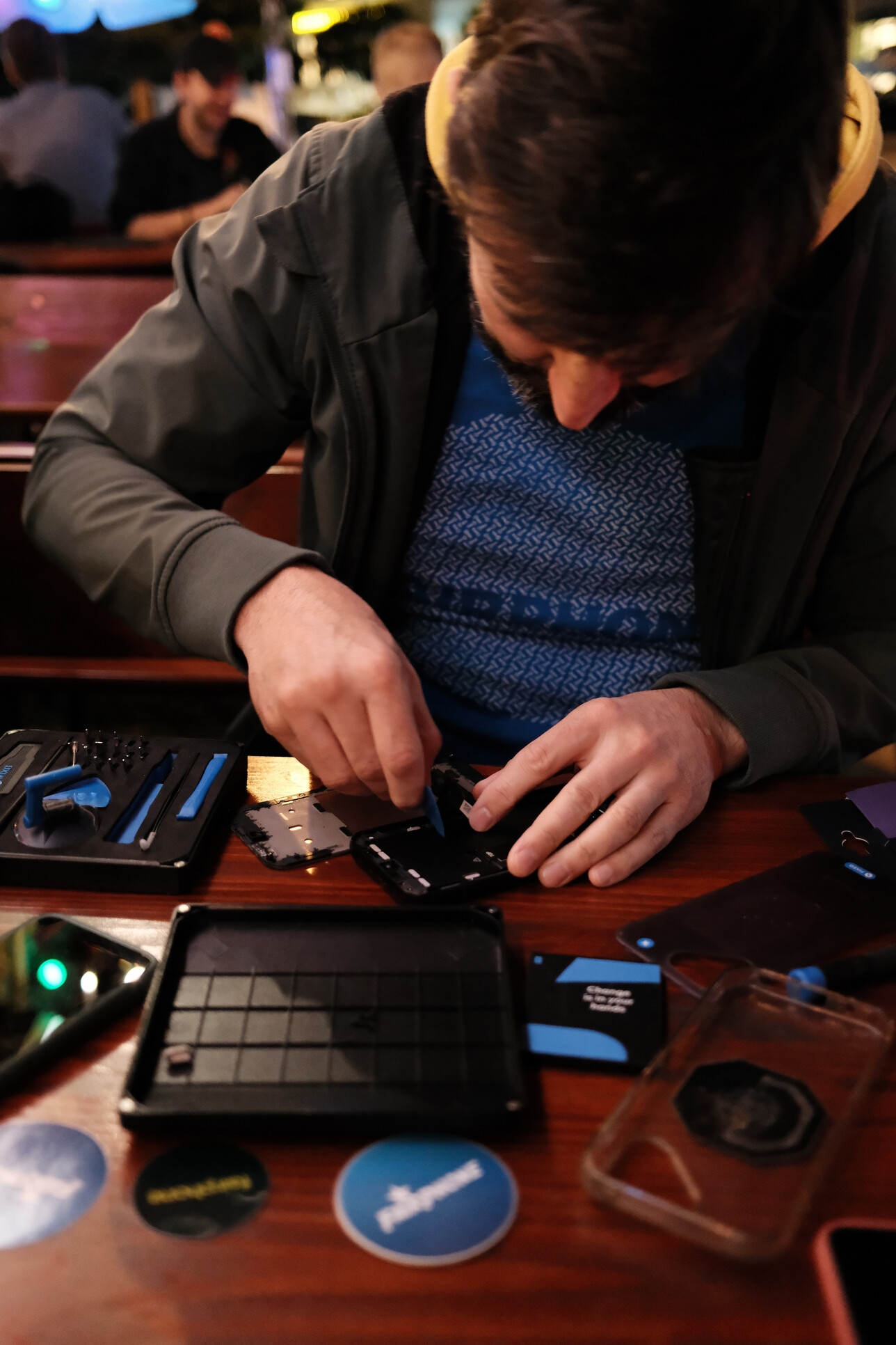 - dann haben wir noch mein FP5 zerlegt, weil ich ich es geschafft hatte trotz Schutzhülle und Schutzfolio mein Display bei einem Sturz auf einen Pflasterstein zu beschädigen