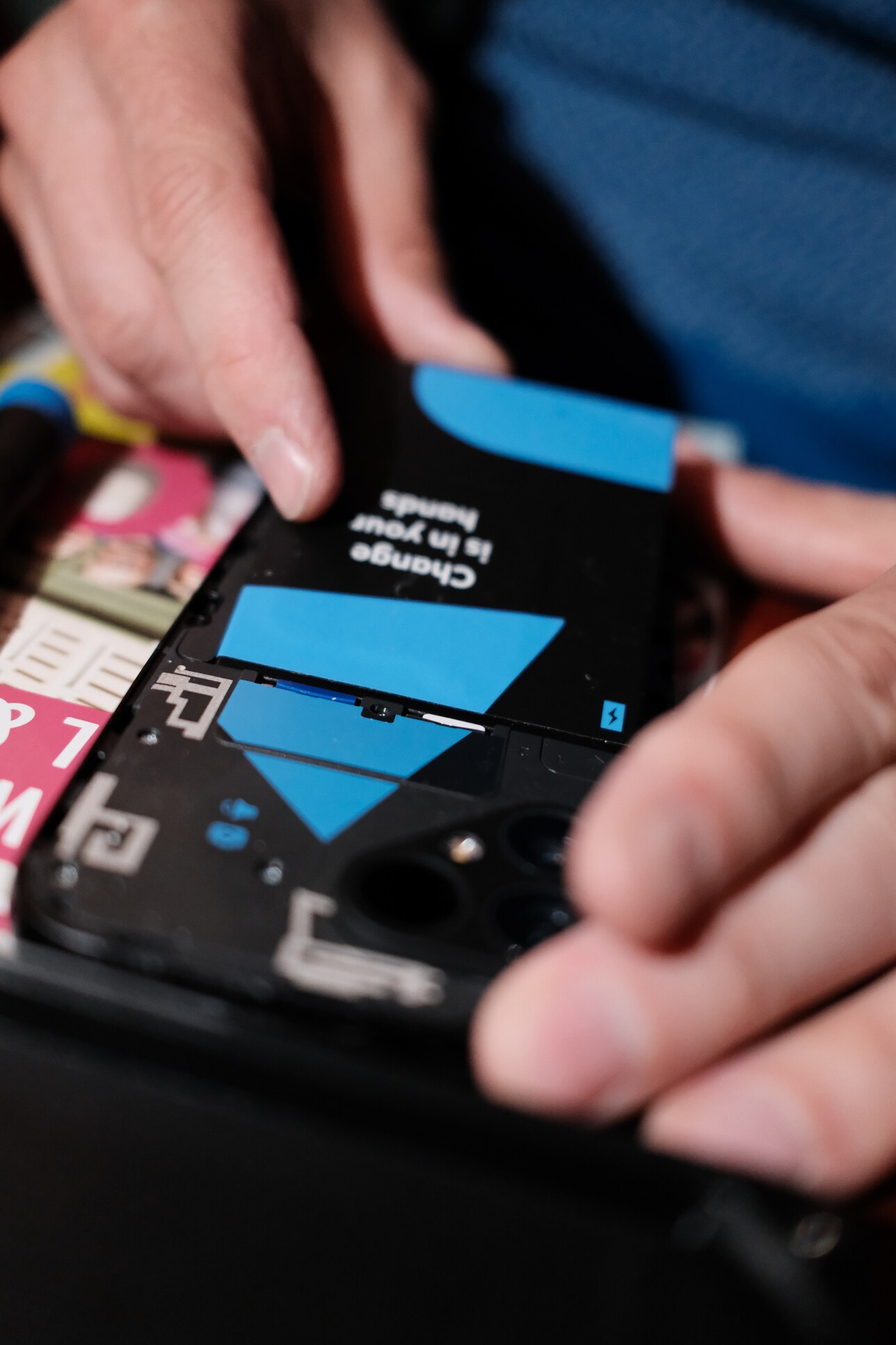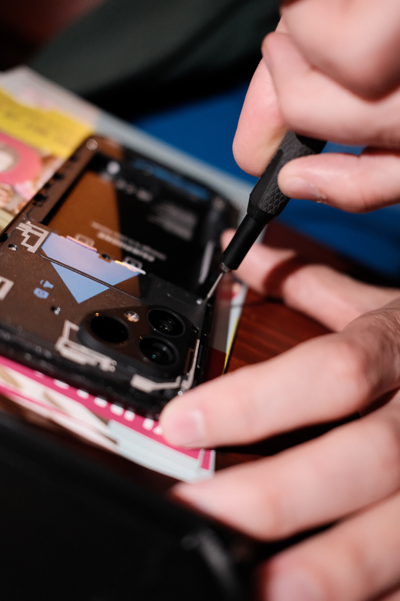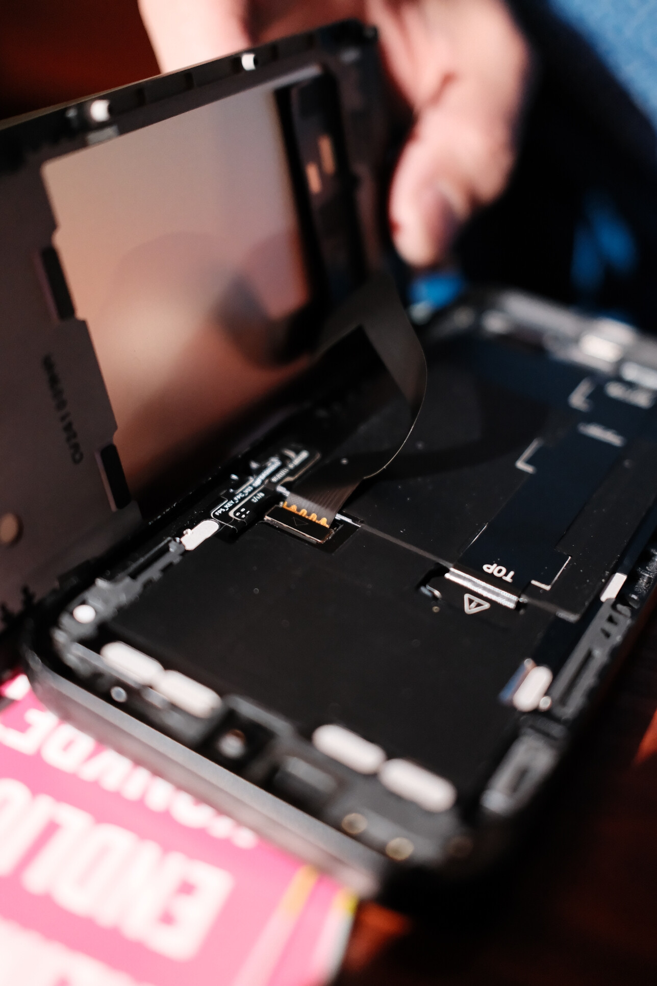 - dann haben wir noch mein FP5 zerlegt, weil ich ich es geschafft hatte trotz Schutzhülle und Schutzfolio mein Display bei einem Sturz auf einen Pflasterstein zu beschädigen