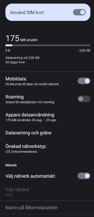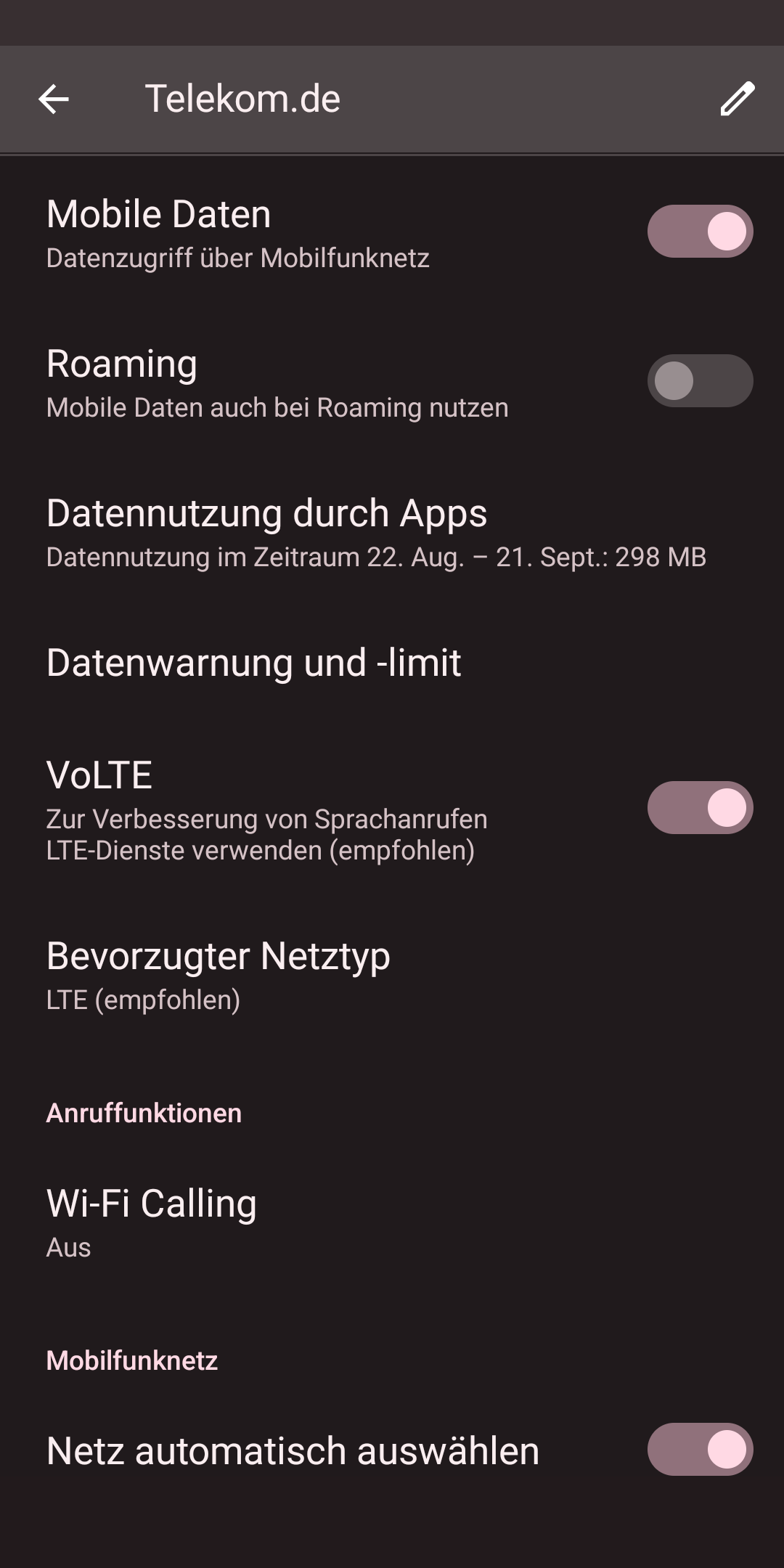 … steps 1 and 2 work, but in step 3, I don’t see any option for 4G Calling or Wi-Fi Calling. The options are in Swedish, but they translate to something like “Mobile data”, “Roaming”, “App data usage”, “Data warning and quota”, “Network type”, “Choose network automatically”, “Name of access points”. See attached screen.