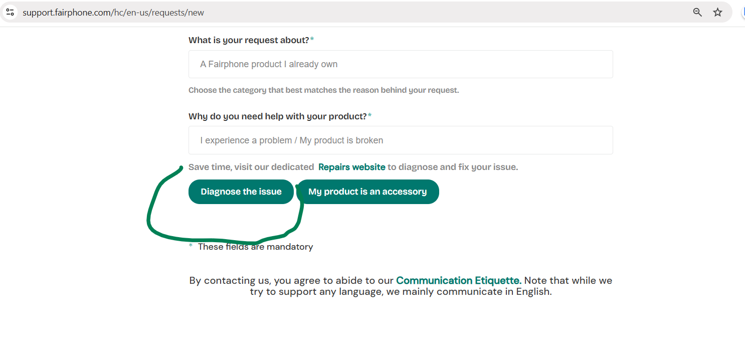 When direct ticket creation is required (e.g. issue not listed), you can indeed still use this link: https://support.fairphone.com/hc/en-us/requests/new.