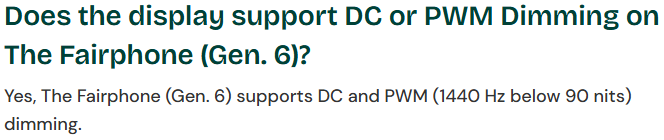 Dear all, according the information from Fairphone’s website the FP6 provides DC and PWM as dimming options for adjusting the brightness af the display.