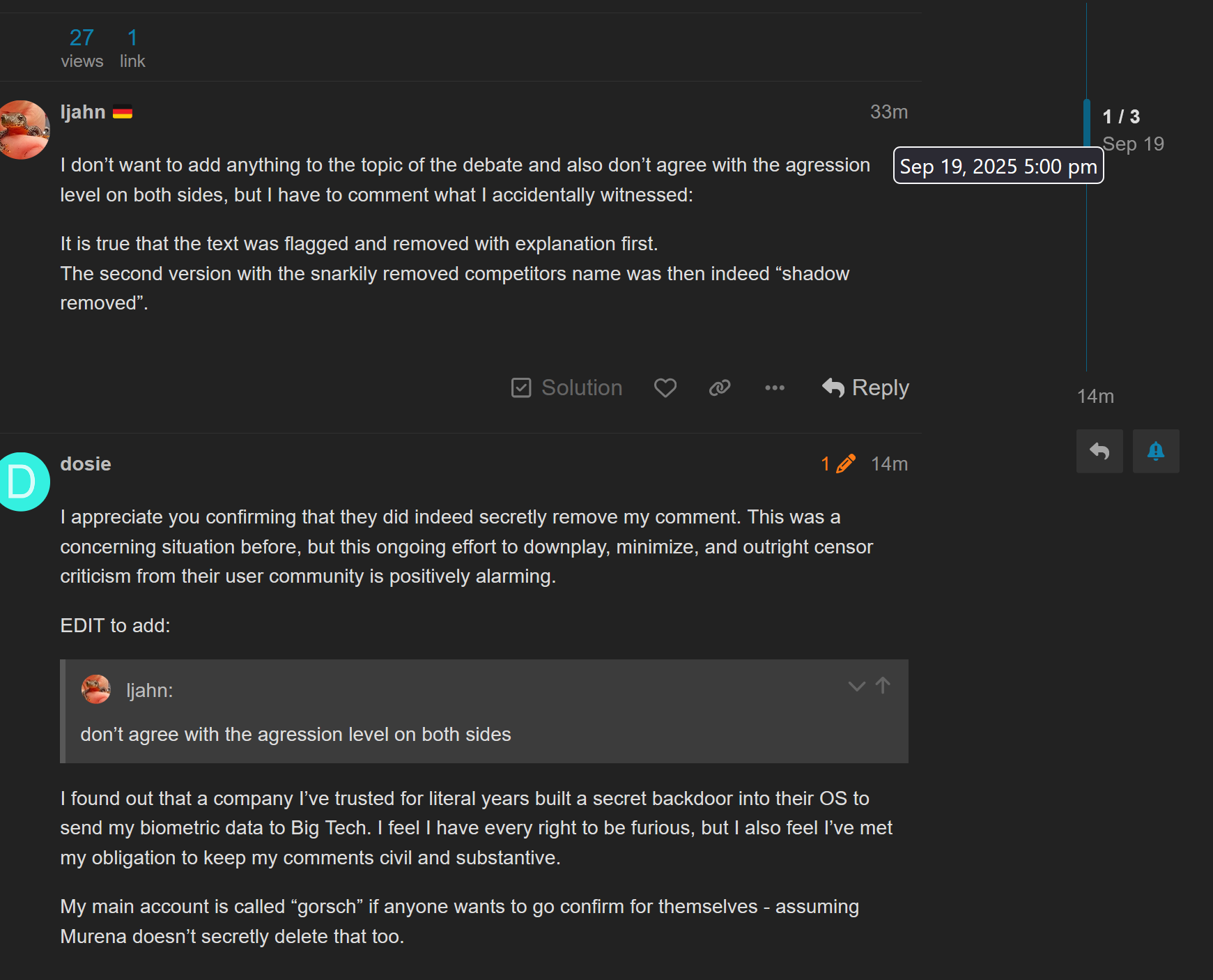 Well, now theyāre actively purging their forums of user commentary, including shadow-removing posts and wholesale deleting entire accounts. I grabbed a screenshot of this before they could delete it: