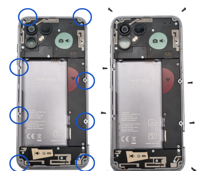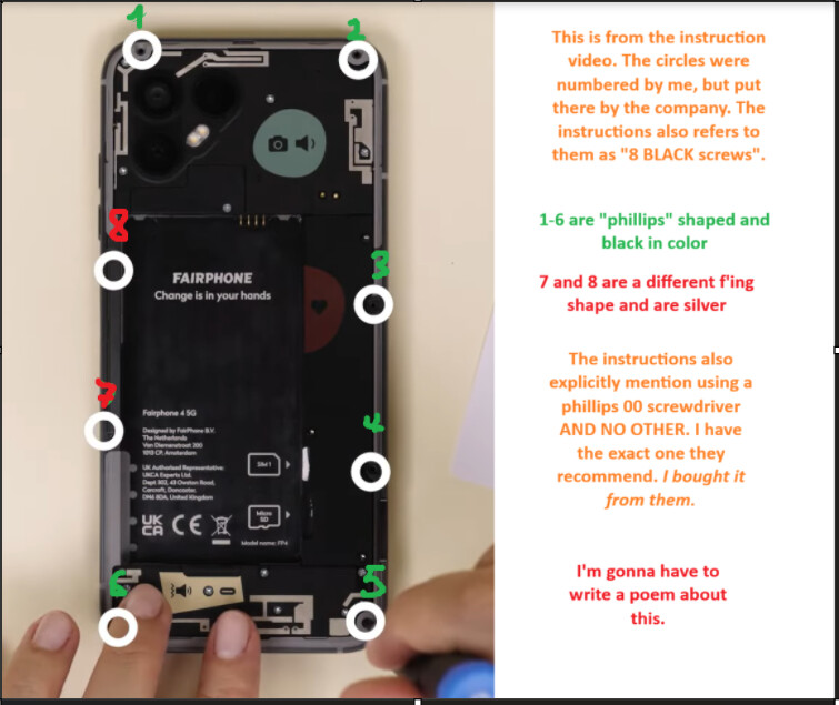 One more thought: IF for whatever reason someone placed Torx screws (instead of Phillips 00) in your holes 7 and 8, my very recent experience with Torx T5 screws on a different Fairphone was that there I had more luck with a T4 driver