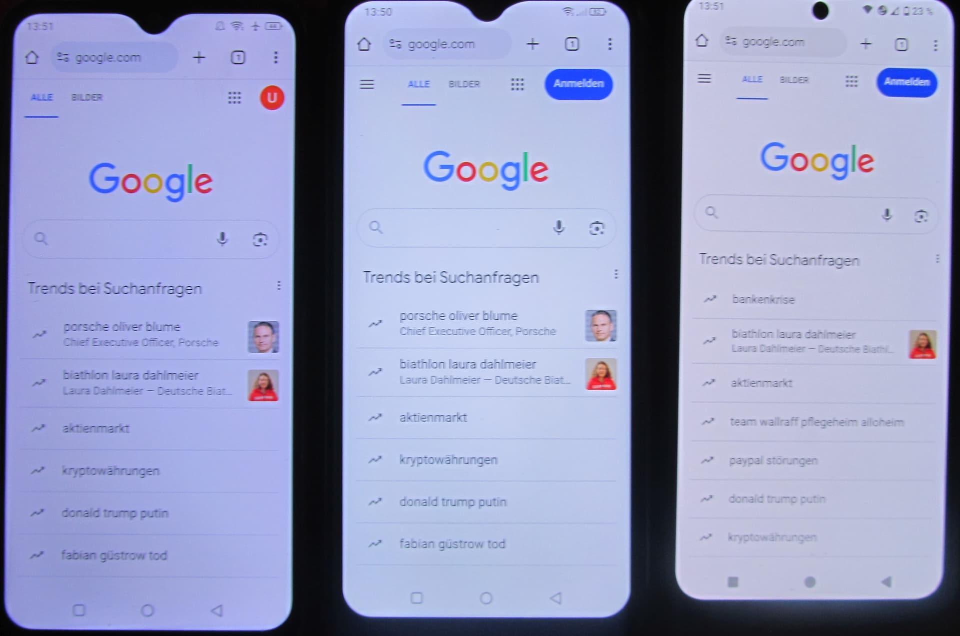 In the meantime, Iâve been thinking about how to easily compare the displays. Iâve opened the Chrome app, closed all tabs, and now I get a white screen with Chromeâs colorful logo. Here are one photo of my three phones. Unfortunately, due to interference with my old camera, this should only be considered an example. In real-life comparison, my old phone (LCD on the left) has a rather cold display. I was happy with it for five years. In the middle, my wifeâs phone, the successor to my old phone (i.e., LCD), is a bit warmer and looks almost like the screen on my FP6. And when I look at them all in direct comparison, I like the screen on my FP6 (right) the best. I assume it will take some time (and I no longer have anything to compare it to e.g. my old phone) to get used to the display.