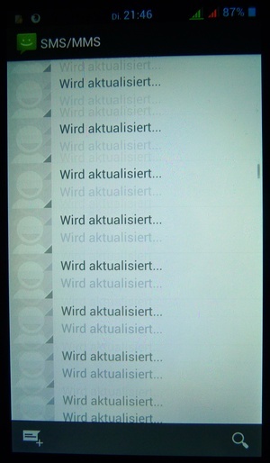After some time and filling up my FP1 with a lot of SMS messages (some hundreds, maybe thousands?) I noticed that during scrolling through the list of SMS the messages “Is beeing updated” (“Wird aktualisiert”) is displayd.