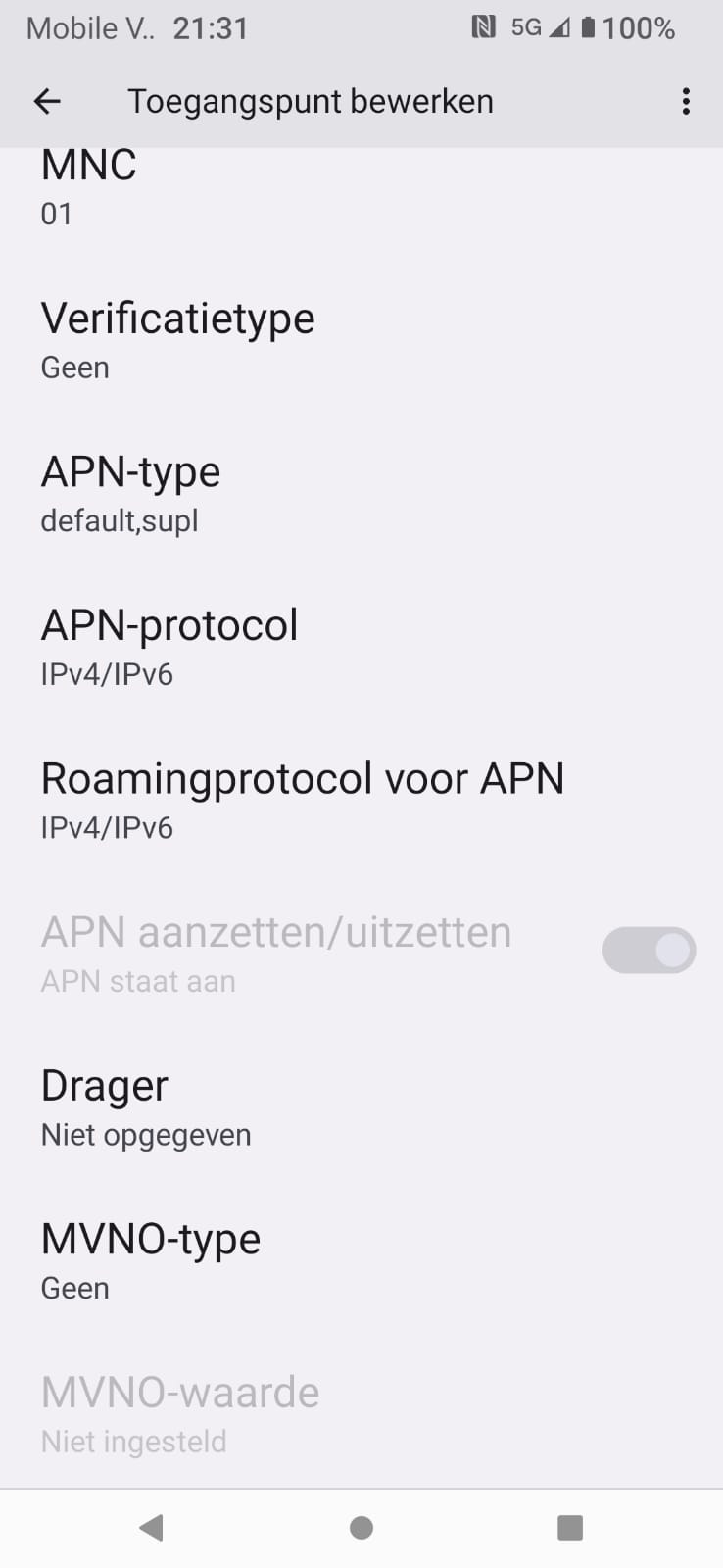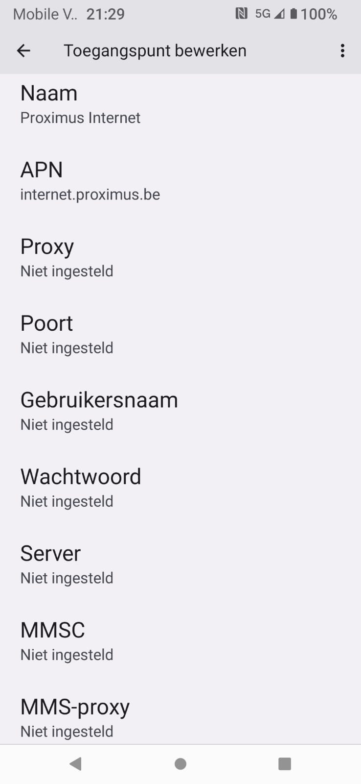 Na de reset naar fabrieksinstellingen stond het verificatietype initieel op PAP, maar daarmee verbond mijn Fairphone niet met het Proximus netwerk. Toen nog eens gaan opzoeken op MV- en Proximus website en daar staat verificatietype βgeenβ