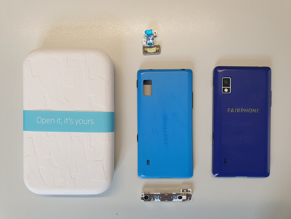 Neben der Originalverpackung gibt es gratis dazu: Den Original-Kamerasatz vorn/hinten (verbaut ist das 5MP-Topmodul und die 12 MP Frontkamera), den Akku FP2-BAT01 und ein ursprüngliches Backcover mit Gummirahmen in Mülltüten-blau (bisher unbenutzt).