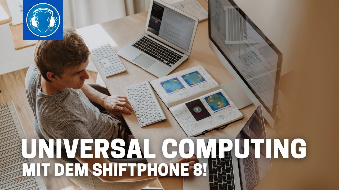Hier zeigt jemand eine frühe Version des Shiftphone 8 im Desktop-Modus, d.h. per USB-C Hub mit Monitor, Tastatur, Maus und Ladegerät verbunden.