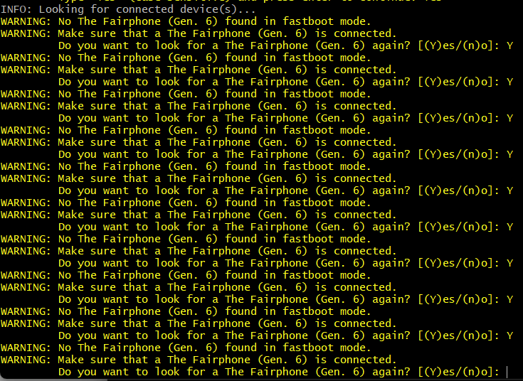 Hello i made a vidéo of the issue just so you see, i know i typed Yes instead of Y at the fairphone 6 discovery fail, but as we see at the end even Y does not work and it crash