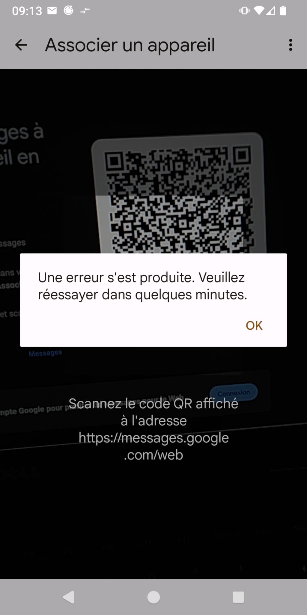 Upon trying to sync my phone with Messages for web, I get “An error occurred. Please try again later.” (see attached pic for the french screenshot).