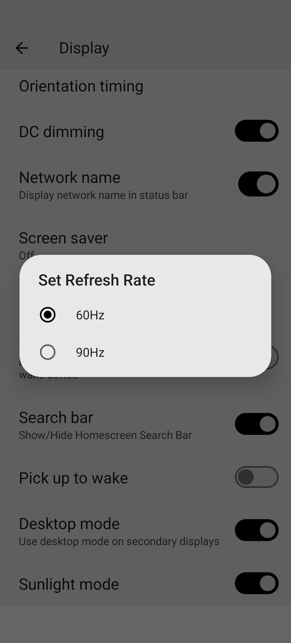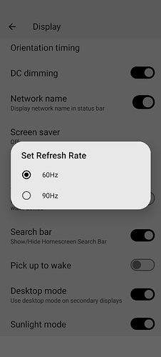 Although the display renders at 60 Hz, com.android.settings does not indicate this in the relevant context menu’s circular checkboxes. Consequently, the user must select 60 and then 90 Hz to remediate this.