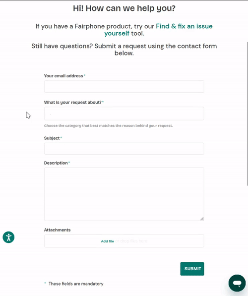 I want to submit a support request through https://support.fairphone.com/hc/en-us/requests/new for a hardware related issue, but when I select “I experience a problem / My product is broken”, I get no way to proceed with the ticket.