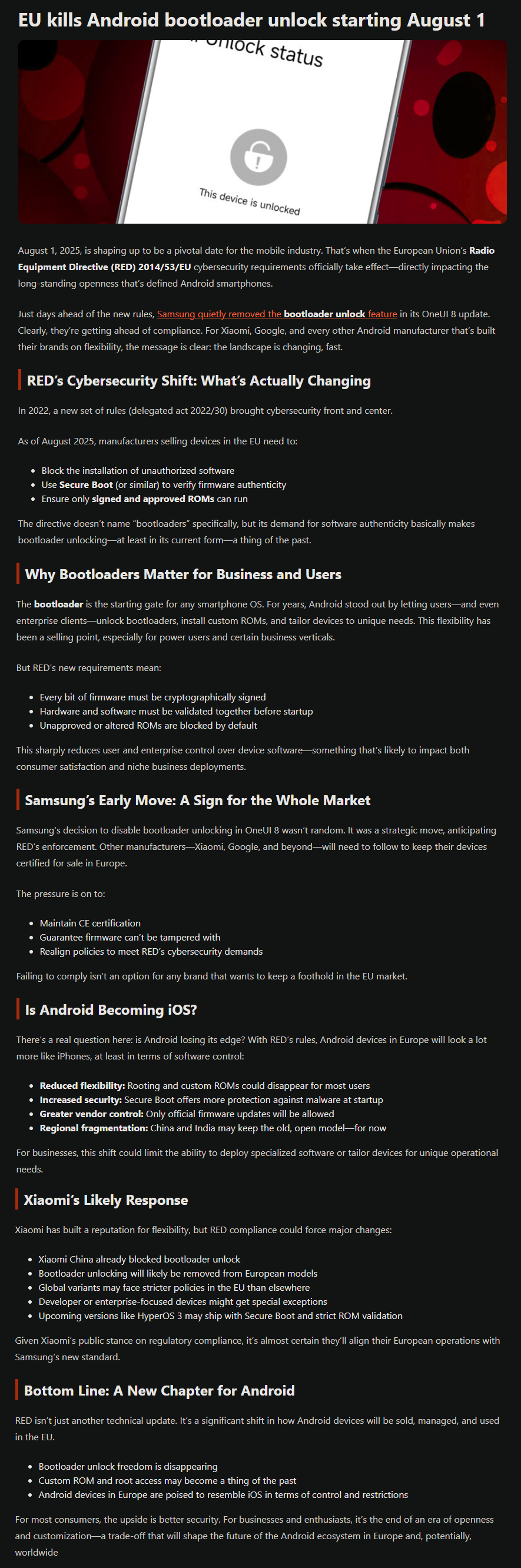 As a consequence, Samsung, Xiaomi, and Google phone makers are removing bootloader unlock feature from their mobile phones for at least EU market.