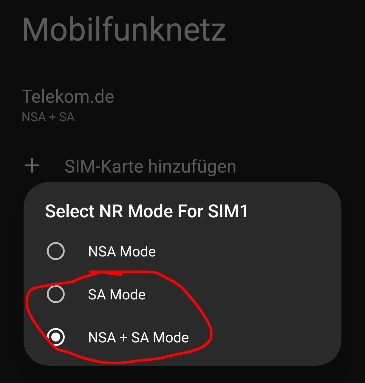 3.Schritt: Den Modus auf SA oder NSA+SA ändern (Der unterschied ist das bei SA nur 5G angezeigt und genutzt wird wenn man auch wirklich mit SA verbunden ist. Bei NSA+SA wird 5G auch dann angezeigt wenn NSA auf dem Mast theoretisch möglich ist man damit aber gar nicht verbunden ist und es wird auch 5G angezeigt wenn man nicht mit 5G SA sondern nur NSA verbunden ist.)