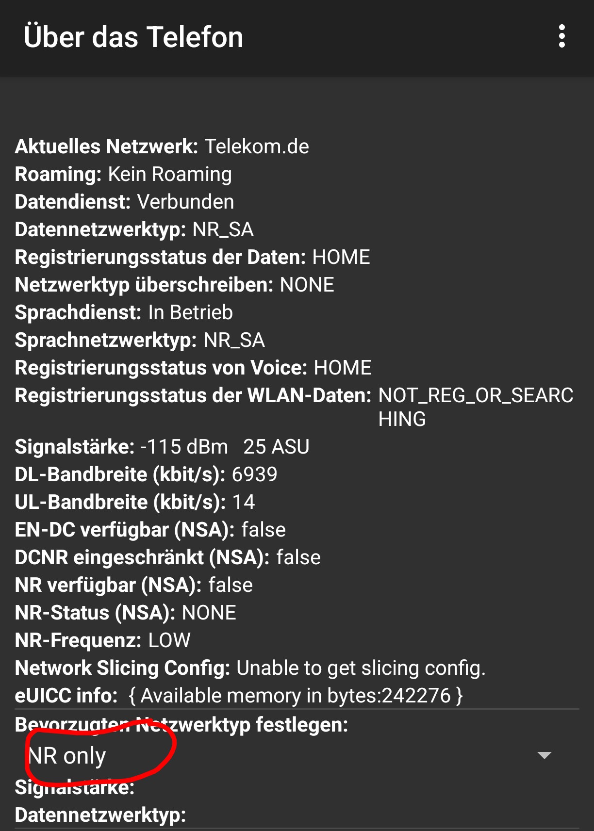 Für 5G SA ist es auch notwendig die entsprechend in der Regel kostenlose 5G Plus Option (bei der Telekom 5G Gaming) gebucht zu haben. Man kann trotzdem in Netmonster sehen ob rein theoretisch 5G SA möglich wäre, nach einer gewissen Zeit wird dann nämlich der Notfallmodus aktiviert in dem dann zwar nur Notrufe möglich sind allerdings wird dann auch eine 5G SA Zelle angezeigt. Ohne die gebuchte Option wird nämlich netzseitig die Verbindung ins 5G SA Netz geblockt. Wenn man auf SA umschaltet wird außerdem NSA abgeschaltet. Deswegen fällt man dann auf LTE zurück am besten über das Telefon NR only aktivieren sonst kann man nicht feststellen ob SA verfügbar ist da das Endgerät sich nicht immer für die reine 5G Verbindung entscheidet. Bei der Telekom fällt man spätestens nach dem ersten Telefonat auf LTE zurück und das Endgerät bleibt dann auch dort.